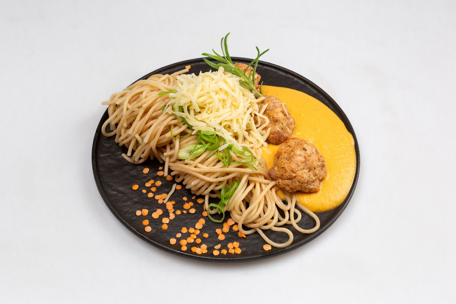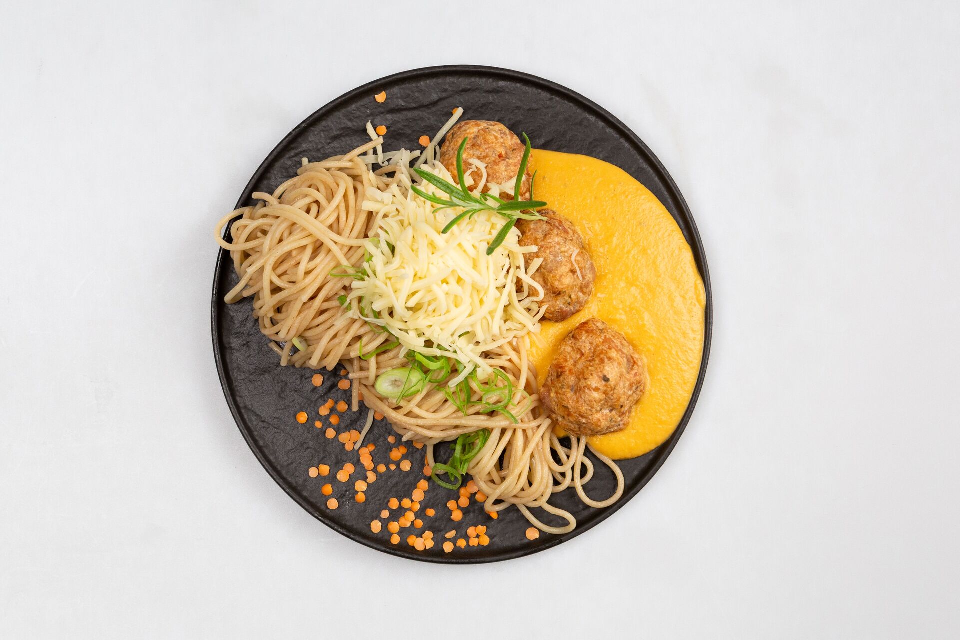 Kuřecí mleté kuličky se špagetami s omáčkou z červené čočky